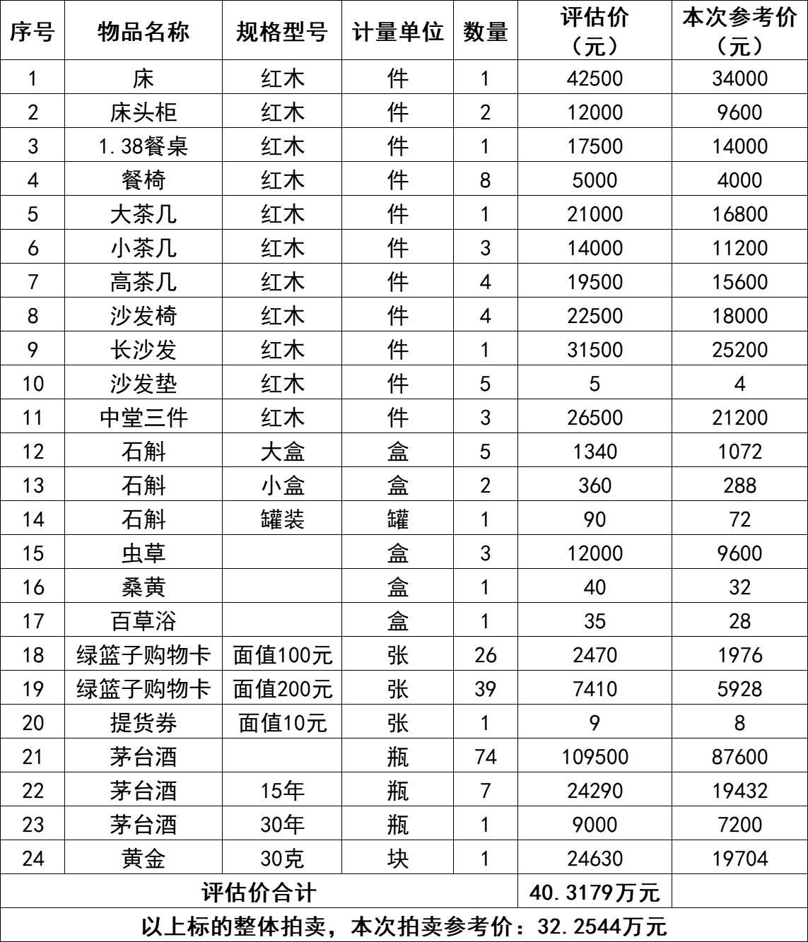一、拍賣標的:茅臺酒、黃金、紅木家具等物品一批,整體打包拍賣,參考價:32.2544萬元。競買保證金:6萬元。詳見下方明細表: