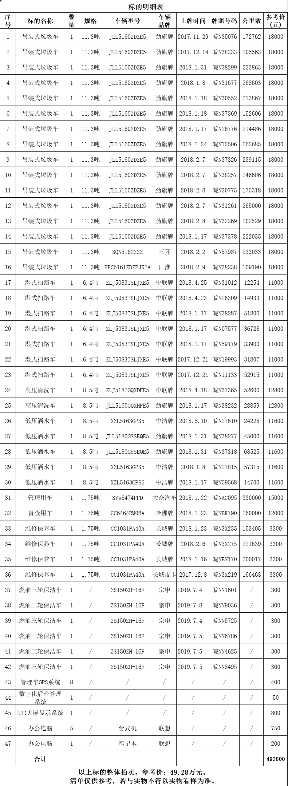 吊裝式垃圾車16輛、濕式掃路車7輛、高壓清洗車2輛、低壓灑水車5輛、管理用車1輛、督查用車1輛、維修保養(yǎng)車4輛、燃油三輪保潔車6輛、辦公電腦6臺(tái)以及管理車GPS系統(tǒng)等整體拍賣,拍賣參考價(jià):49.28萬元。