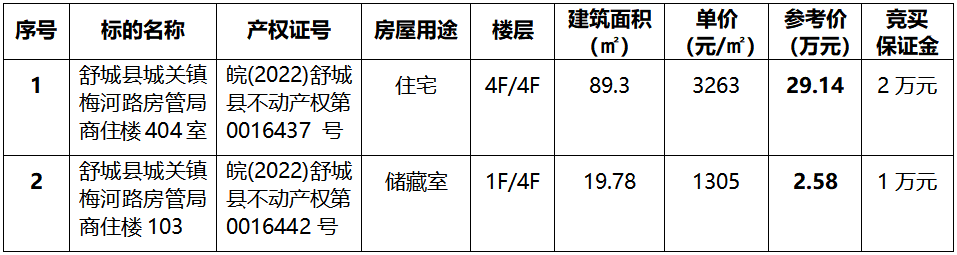 一、拍賣(mài)標(biāo)的:舒城縣城關(guān)鎮(zhèn)梅河路房管局商住樓404室住宅房及103儲(chǔ)藏室,拍賣(mài)標(biāo)的詳情見(jiàn)下表: