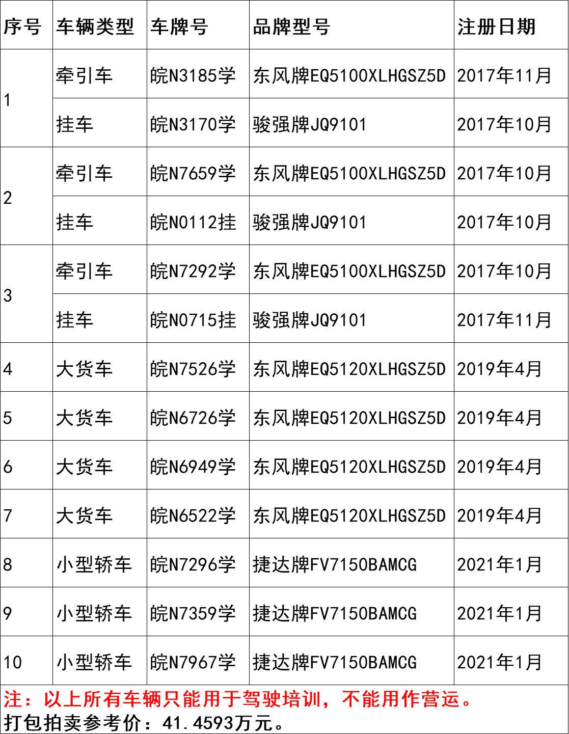 3、皖N3185學(xué)/皖N3170學(xué)牽引掛車、皖N7526學(xué)東風(fēng)牌大貨車、皖N7296學(xué)捷達(dá)牌小型轎車等10輛二手車,打包拍賣。參考價(jià):41.4593萬元,競買保證金:5萬元。標(biāo)的詳情見下表: