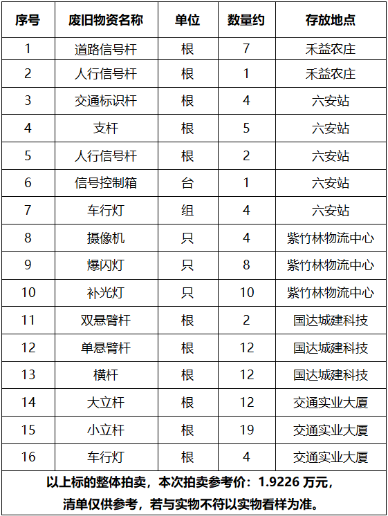 一、拍賣標的:廢舊物資一批,包括道路信號桿、人行信號桿、交通標識桿、大立桿、小立桿、單懸臂桿、雙懸臂桿等,參考價:1.9226萬元。競買保證金:1萬元。