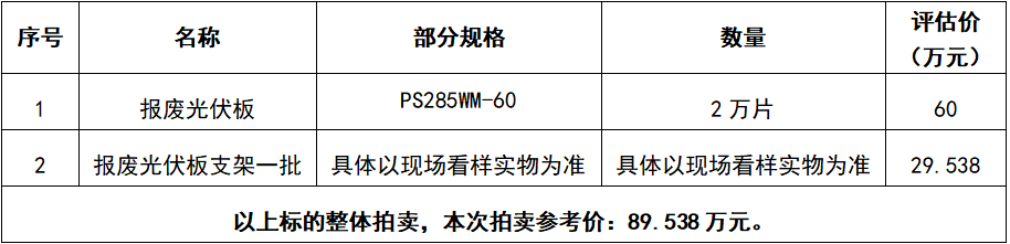 一、拍賣標(biāo)的:報(bào)廢光伏板2萬片及報(bào)廢光伏板支架一批(具體以現(xiàn)場(chǎng)看樣實(shí)物為準(zhǔn)),整體拍賣,參考價(jià):89.538萬元。競(jìng)買保證金:15萬元。