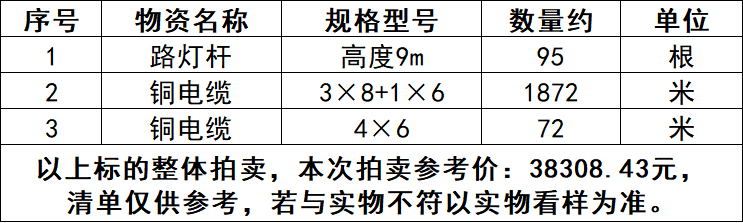 一、拍賣標(biāo)的:廢舊物資一批,包括道路燈桿、銅電纜等,參考價(jià):38308.43元。競(jìng)買保證金:1萬(wàn)元。