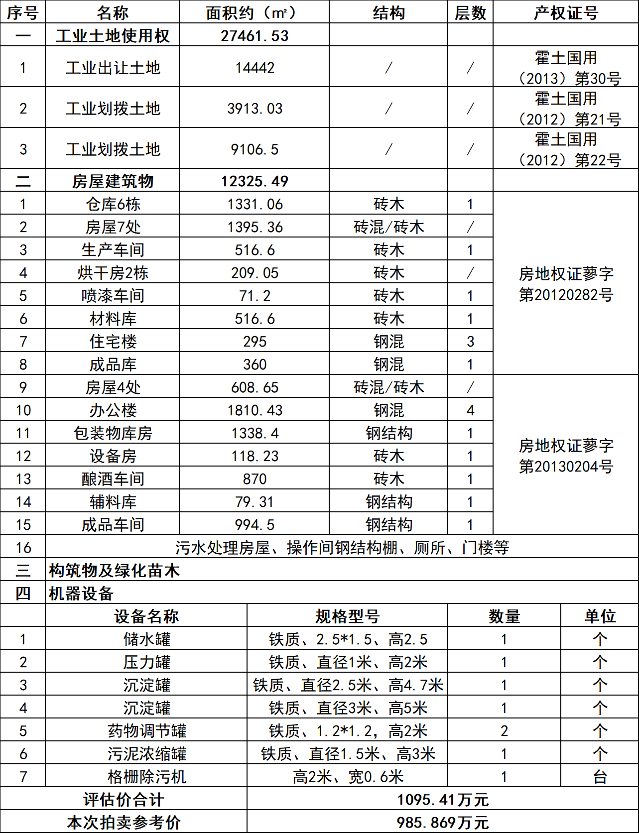 (2)房屋建筑物:倉(cāng)庫(kù)、生產(chǎn)車間、烘干房、辦公樓、住宅樓等,總面積約12325.49㎡;
